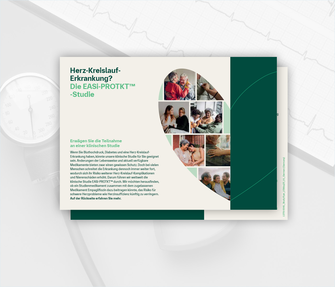Wenn Sie Bluthochdruck, Diabetes und eine Herz-Kreislauf-Erkrankung haben, könnte unsere klinische Studie für Sie geeignet sein. Änderungen der Lebensweise und aktuell verfügbare Medikamente bieten zwar einen gewissen Schutz. Doch bei vielen Menschen schreitet die Erkrankung dennoch immer weiter fort, wodurch sich ihr Risiko weiterer Herz-Kreislauf-Komplikationen und Nierenschäden erhöht. Darum führen wir weltweit die klinische Studie EASi-PROTKT™ durch. Wir möchten herausfinden, ob ein Studienmedikament zusammen mit dem zugelassenen Medikament Empagliflozin dazu beitragen könnte, das Risiko für schwere Herzprobleme wie Herzinsuffizienz künftig zu verringern.